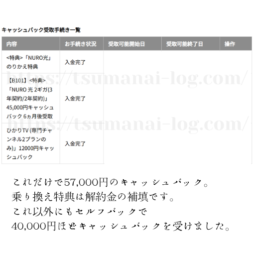 その結果、公式サイトの45,000円キャッシュバックに加えて、他社からの乗り換え特典、さらにA8.netなどのセルフバックを活用して、総額10万円近い還元を受けることができました。